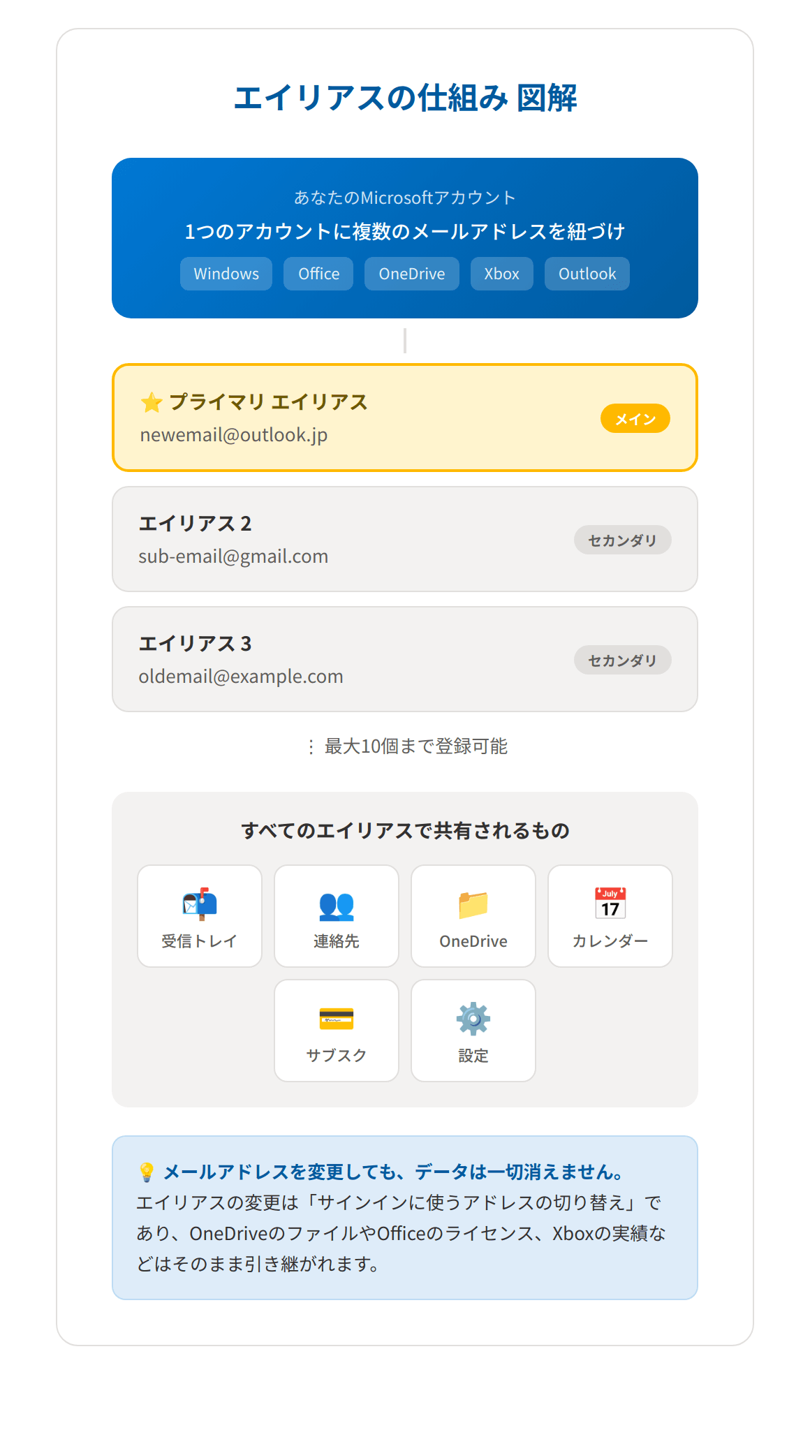 エイリアス同士は受信トレイ、連絡先、OneDriveのデータ、サブスクリプション(Microsoft 365など)をすべて共有しています。メールアドレスを切り替えてもデータが消えることはないのでご安心ください。